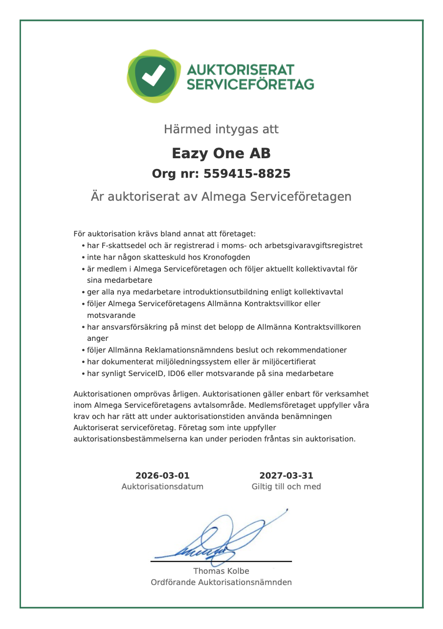 Auktorisationen omprövas årligen. Auktorisationen gäller enbart för verksamhet inom Almega Serviceföretagens avtalsområde. Medlemsföretaget uppfyller våra krav och har rätt att under auktorisationstiden använda benämningen Auktoriserat serviceföretag. Företag som inte uppfyller auktorisationsbestämmelserna kan under perioden fråntas sin auktorisation.