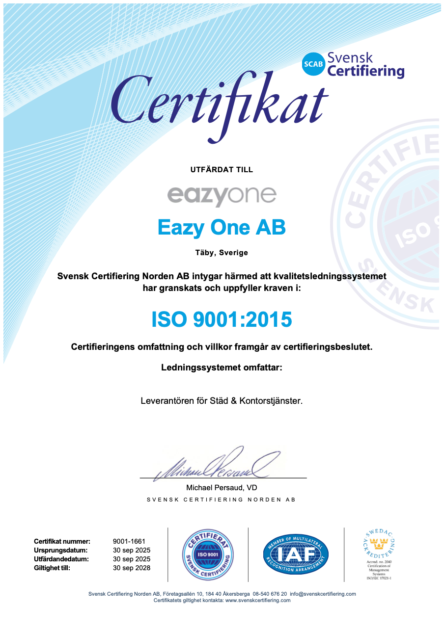 Vårt kvalitets- och miljöarbete är certifierat enligt de internationellt erkända standarderna ISO 9001 (kvalitet), ISO 14001 (miljö) och Almega Serviceföretagen.