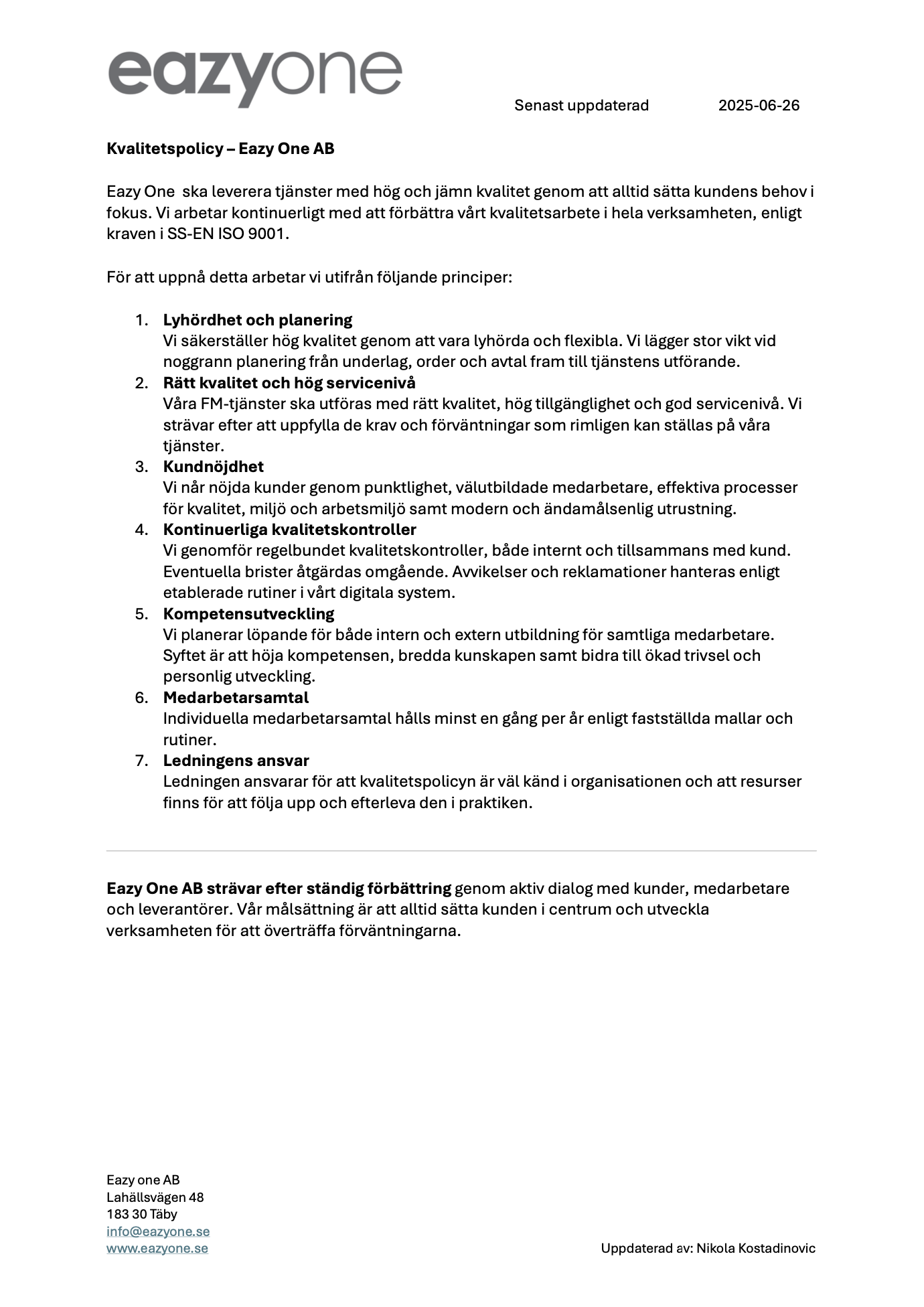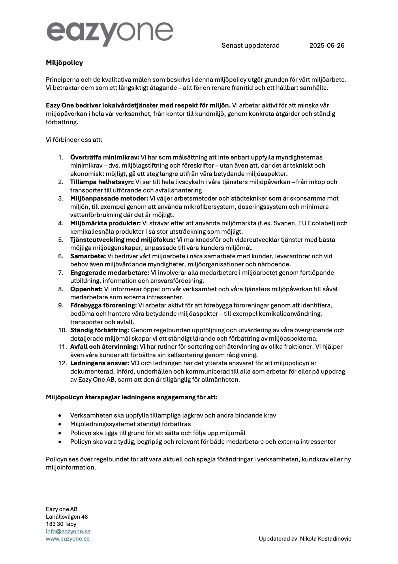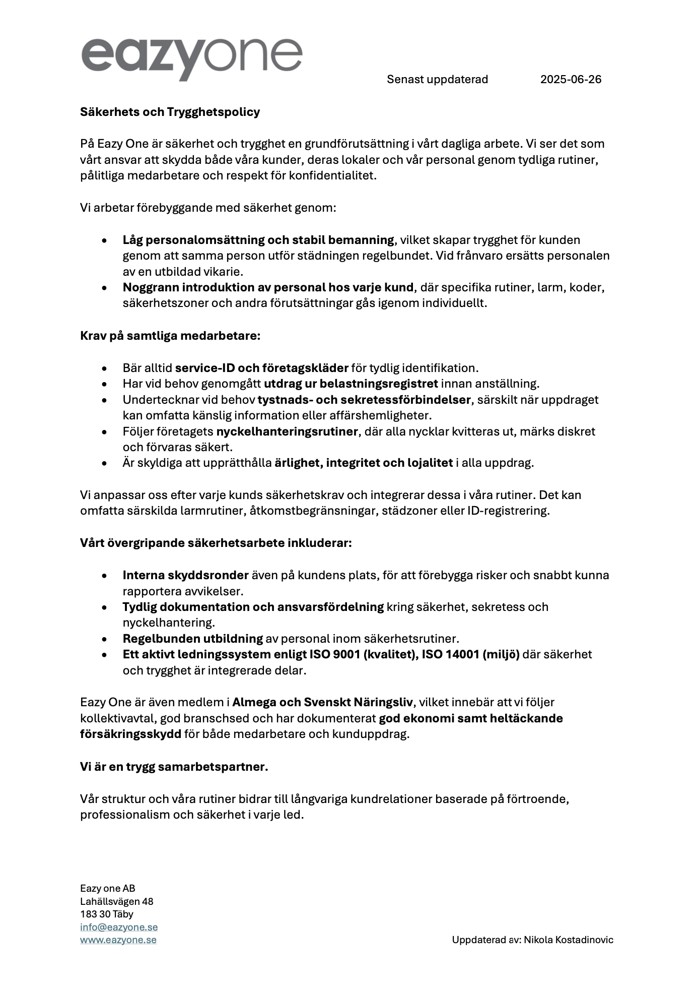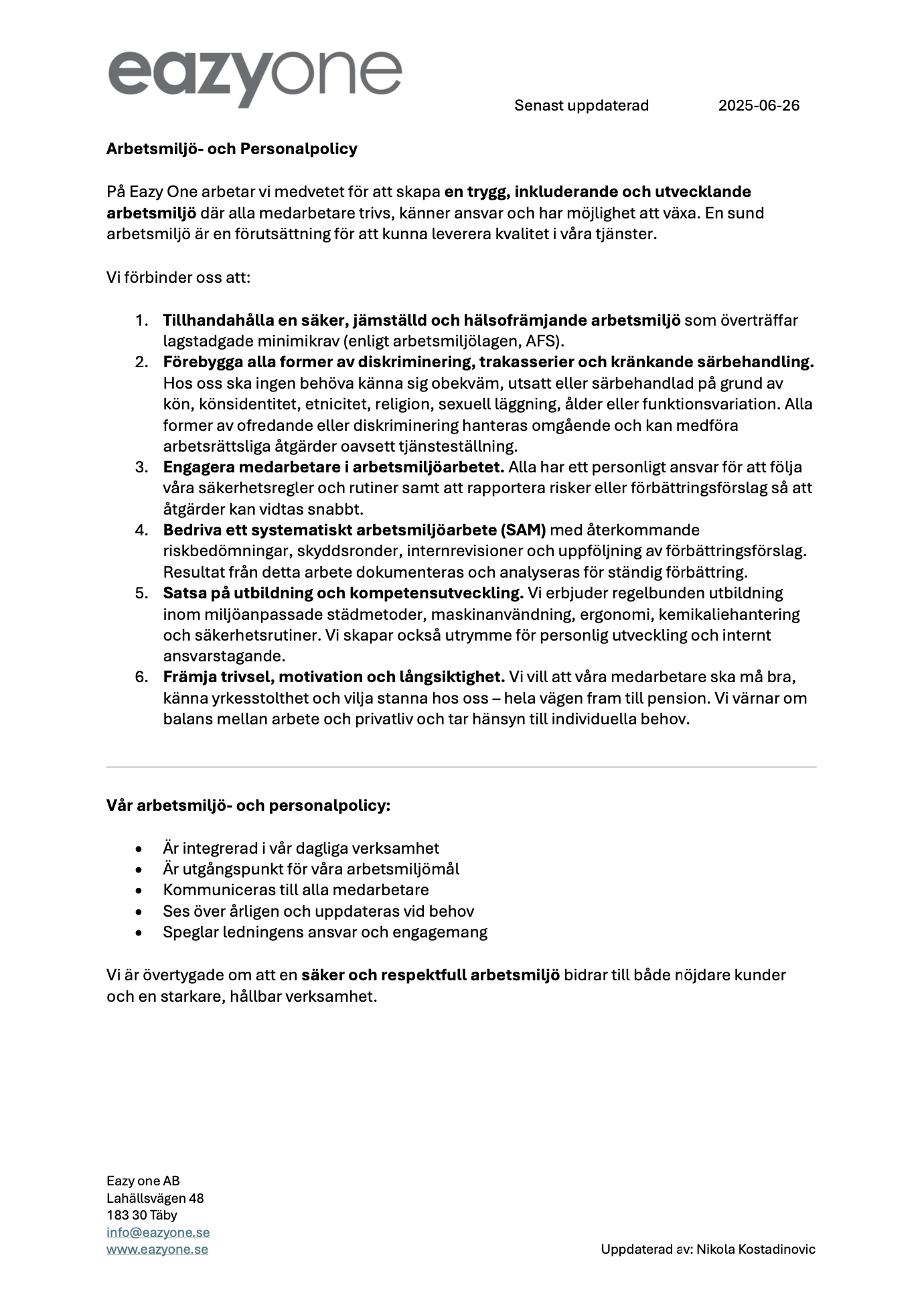 Dessa dokument ligger till grund för vår dagliga verksamhet och visar hur vi aktivt arbetar för en trygg, hållbar och effektiv arbetsmiljö – både för våra medarbetare, kunder och samarbetspartners.