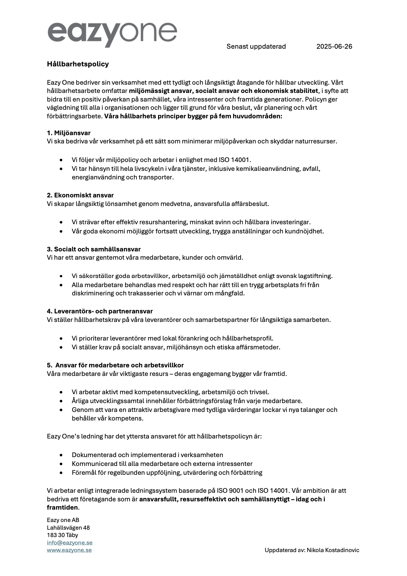 Som en del av vårt kvalitets, miljö- och hållbarhetsarbete arbetar vi systematiskt enligt våra certifieringar och interna riktlinjer. Vi har tagit fram policys som tydligt speglar vårt engagemang inom följande områden: